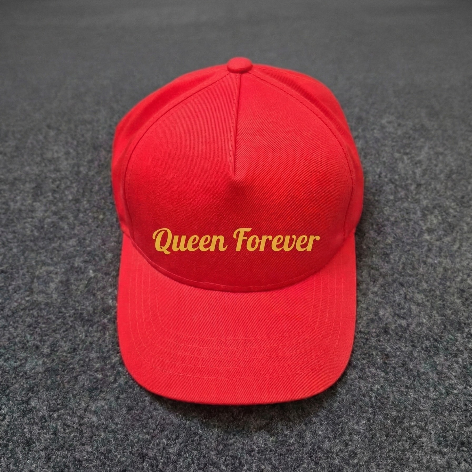 Make your mark with the "Queen Forever" Baseball Cap. This striking headpiece features elegant, golden-yellow typography set against a rich scarlet base, creating a high-contrast look that radiates confidence and style. Whether you're topping off a bold streetwear outfit or adding a pop of color to a casual weekend look, this cap is designed to be the crown of your collection.